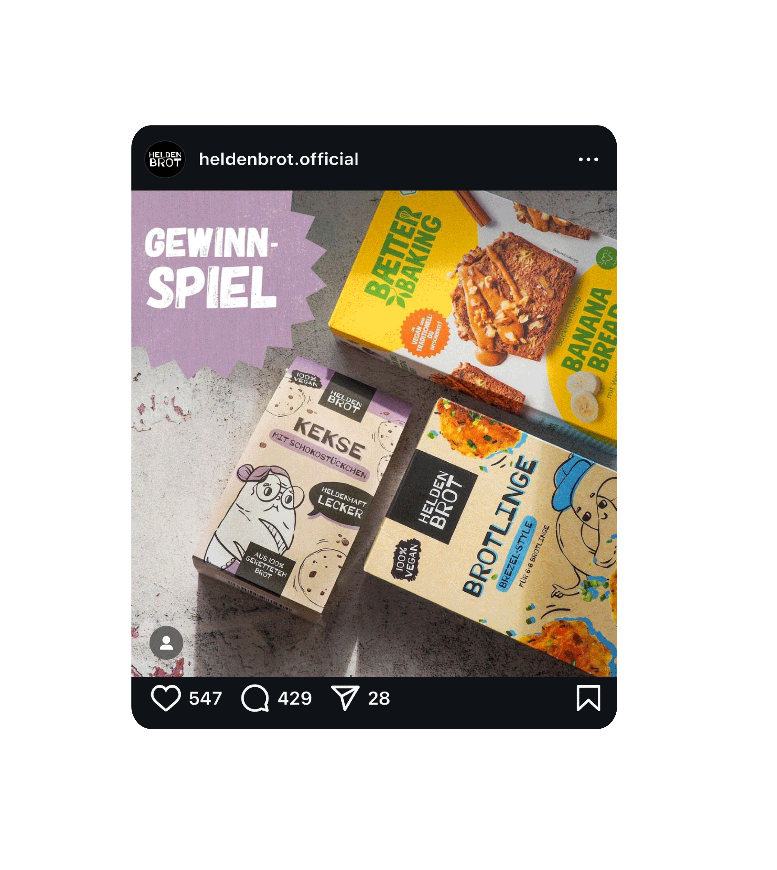 Das Unternehmen Kultimativ GmbH vertreibt unter dem Namen "Heldenbrot" Lebensmittel aus wiederverwertetem "altem" Brot. Die junge, frische Marke habe ich über Instagram mit klaren, kontrastreichen Posts präsentiert und mit Gewinnspielen und deren Organisation beworben. Darüber hinaus habe ich Produktfotografie und Rezeptvideos produziert, sowie Infoposts zum Thema Nachhaltigkeit gestaltet.